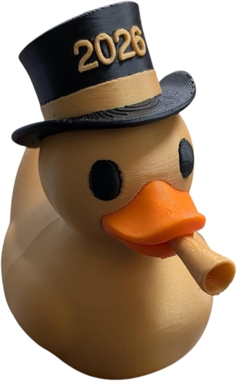 Add the 2026 New Year Duck Figurine with Party Hat & Noisemaker – Festive Yellow Rubber Duck Décor for Adults & Collectors – DV to your shelf — a unique 3D printed duck collectible from our Quebec print farm. This piece is part of a 1,000+ design duck catalog, each printed in premium PLA filament for rich color and fine detail. Every duck we produce reflects our commitment to small-batch quality and creative design.
