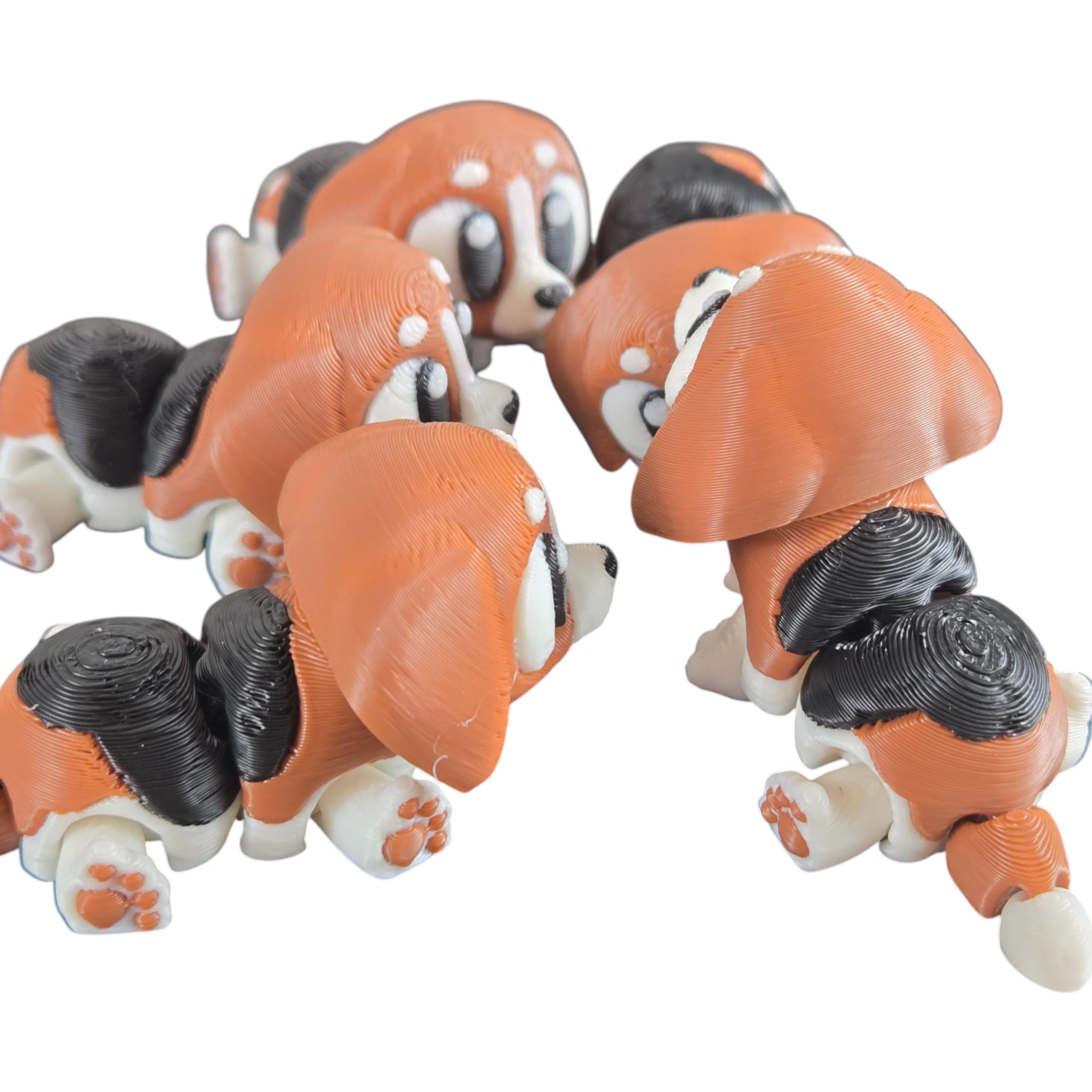 This 5-Pack Mini Baby Beagle Figurines – Articulated Desk Pet Dog Breeds, Collectible Pocket Beagles, Fidget Toys for Teens & Adults – 2 Inch Poseable Figures features print-in-place articulation — multiple moving joints produced in a single, uninterrupted print. Manufactured at our Laval, Quebec facility, each articulated piece balances flexibility at the joints with structural strength in the body, creating a poseable collectible that holds its position for display.
