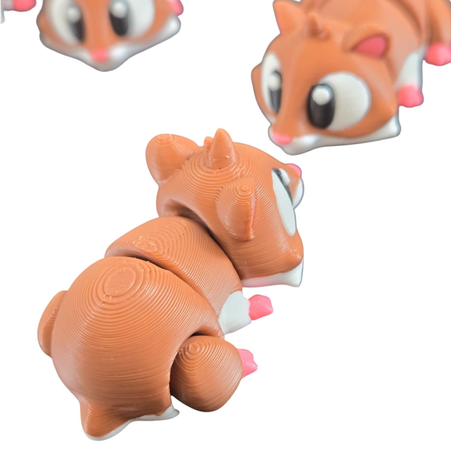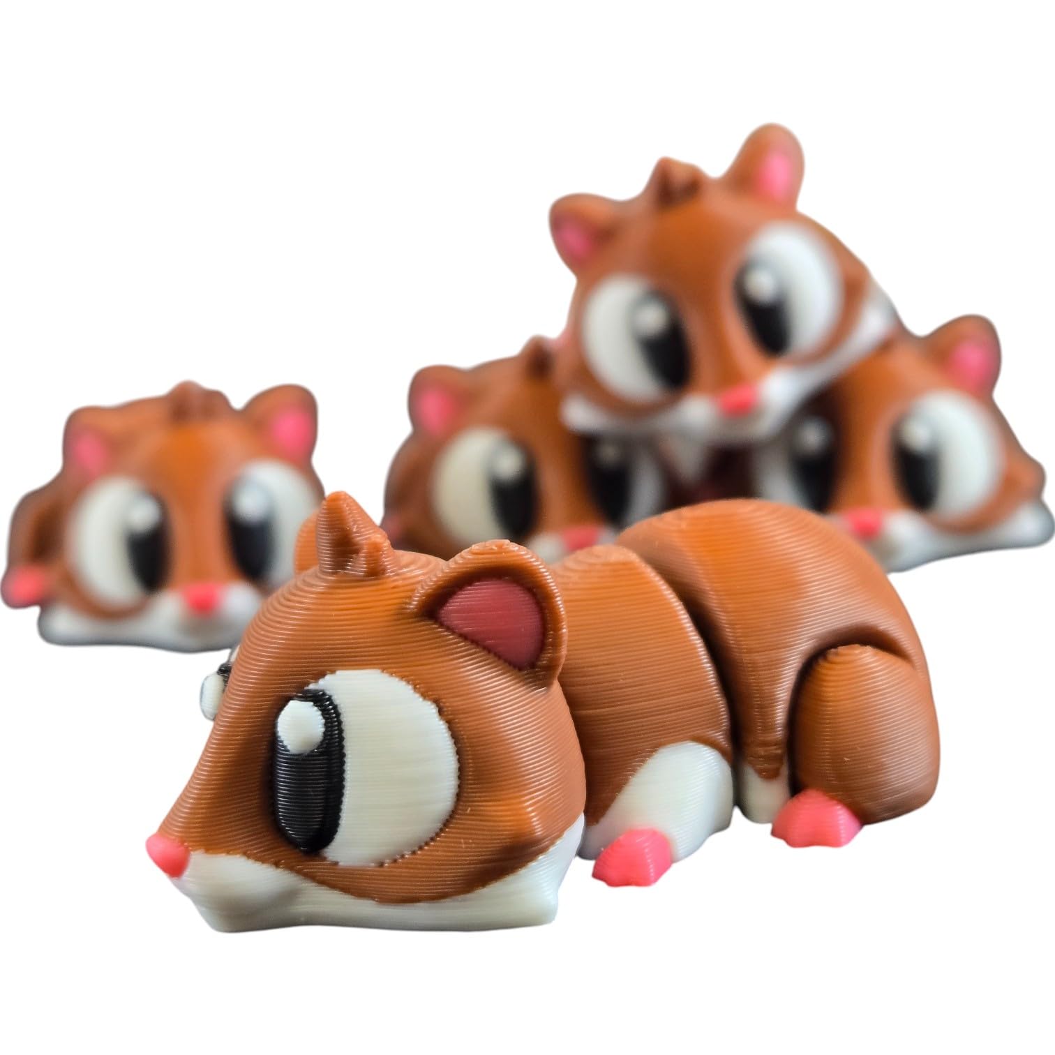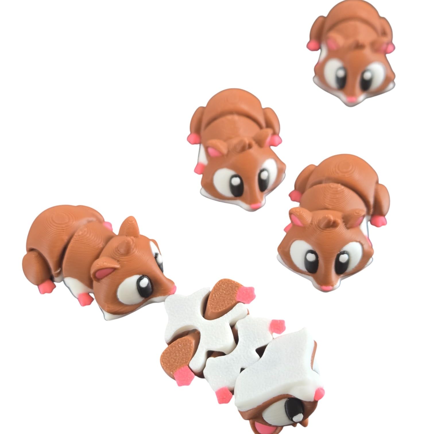This 5-Pack Mini Baby Hamster Figurines – Articulated Desk Pet Rodents, Collectible Pocket Critters, Fidget Toys for Teens & Adults – 2 Inch Poseable Animals features print-in-place articulation — multiple moving joints produced in a single, uninterrupted print. Manufactured at our Laval, Quebec facility, each articulated piece balances flexibility at the joints with structural strength in the body, creating a poseable collectible that holds its position for display.