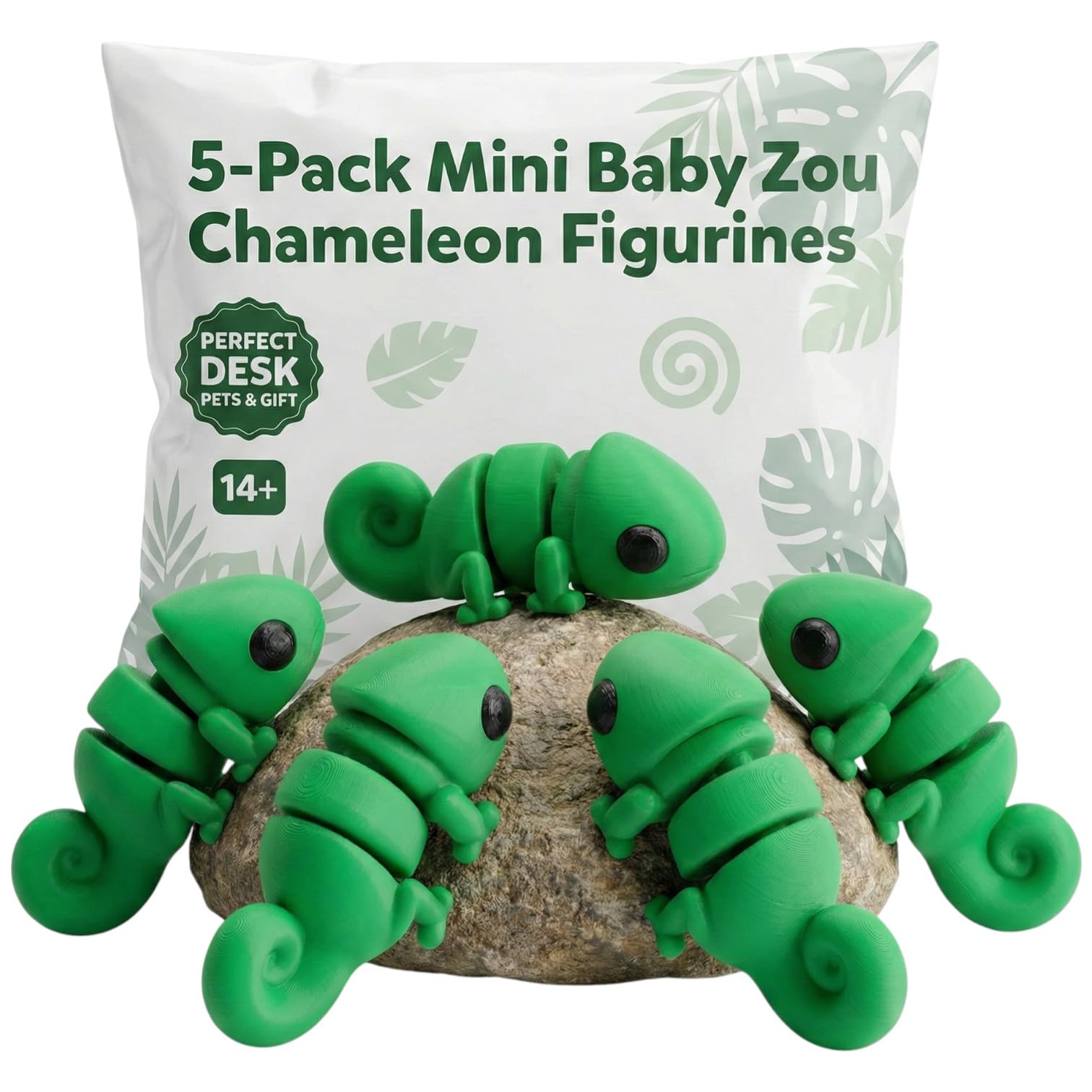 About the 5-Pack Mini Baby Zou Chameleon Figurines – Cute Articulated Lizard Desk Pet for Teens & Adults, Reptile Shelf Decor, Stress Relief Fidget Collectible