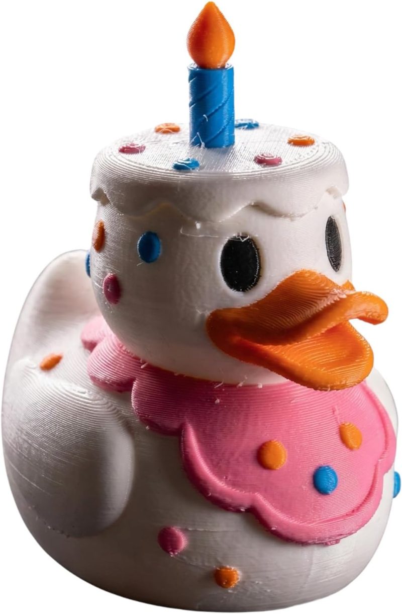 The Birthday Cake Duck Figurine with Candle Hat – Cute Decorative Party Duck Sculpture for Shelf, Desk, or Gift is a decorative 3D printed collectible from 3DCentral’s extensive duck collection. Printed at our Quebec-based industrial print farm, this piece captures the playful spirit of rubber duck culture with modern additive manufacturing precision. Premium PLA filament ensures vibrant colors and a smooth, display-ready finish straight out of the box.