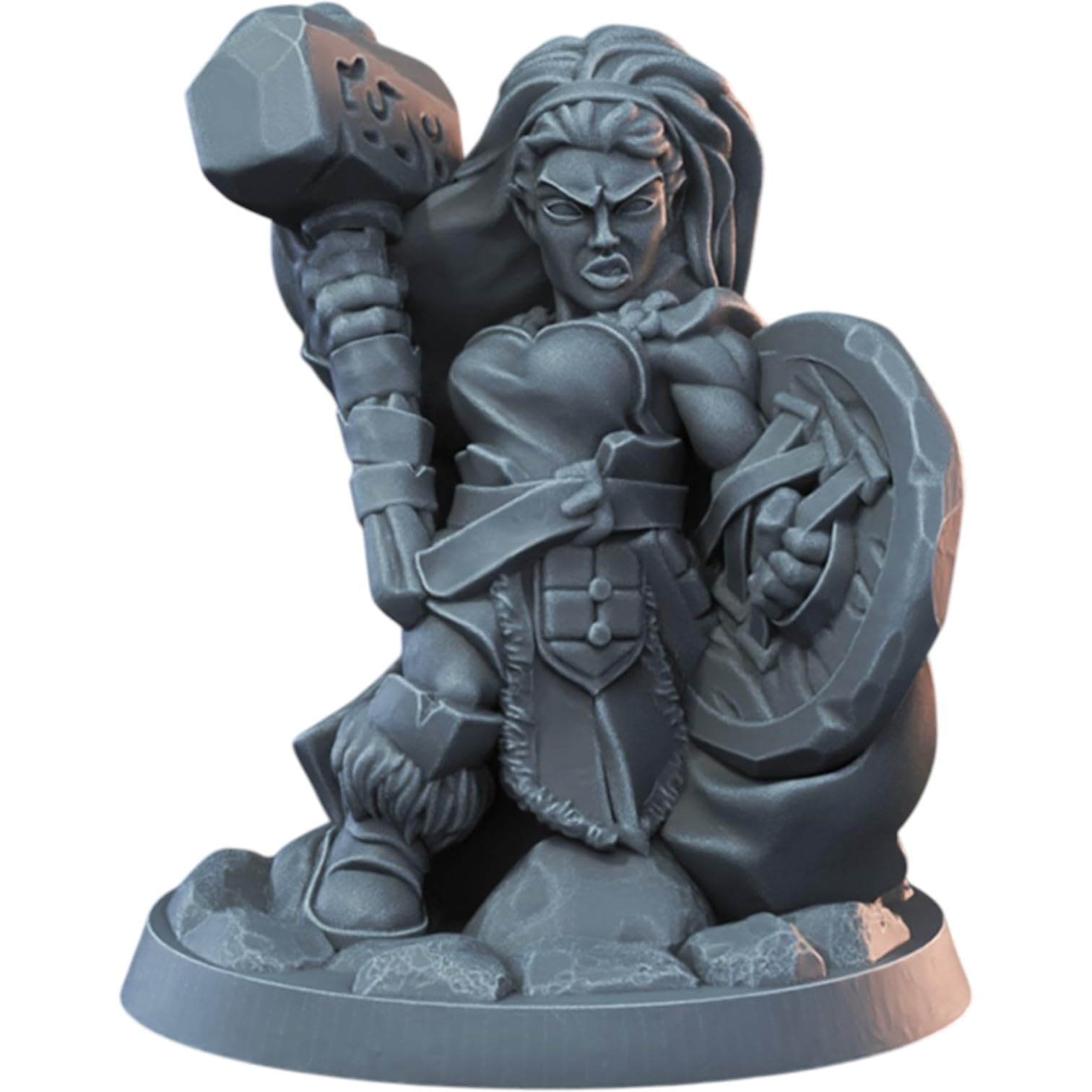 About the Dwarf Female Miniature for Fantasy TTRPGs – 32mm Warrior Model with Hammer and Shield for Tabletop Roleplaying & Painting