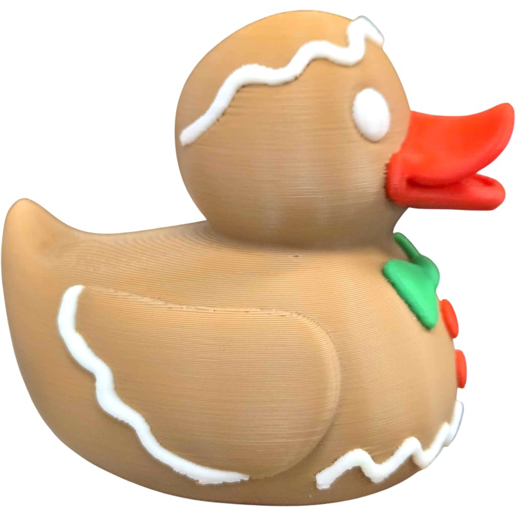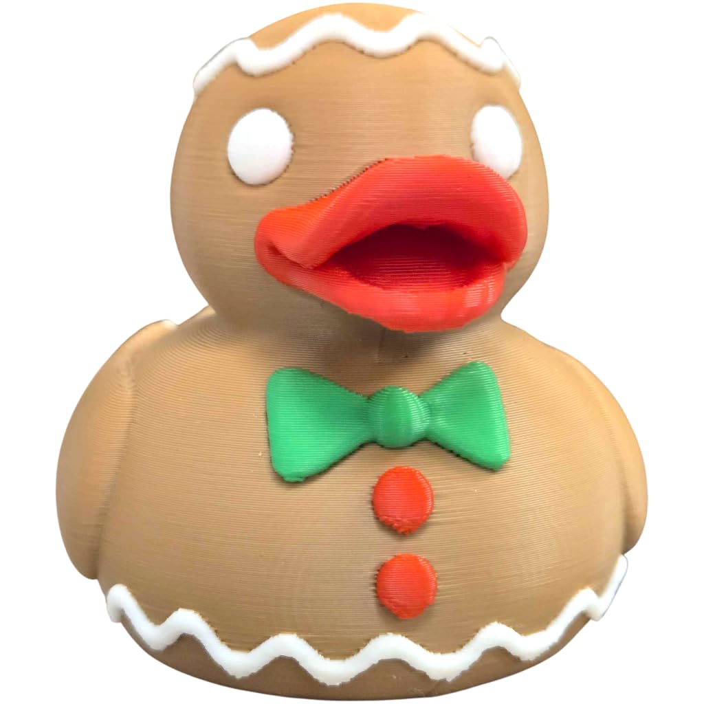Add the Gingerbread Duck Figurine – Festive Holiday Rubber Duck-Style Décor for Shelf or Desk – Cute Christmas Display Ornament for Adults & Teens to your shelf — a unique 3D printed duck collectible from our Quebec print farm. This piece is part of a 1,000+ design duck catalog, each printed in premium PLA filament for rich color and fine detail. Every duck we produce reflects our commitment to small-batch quality and creative design.