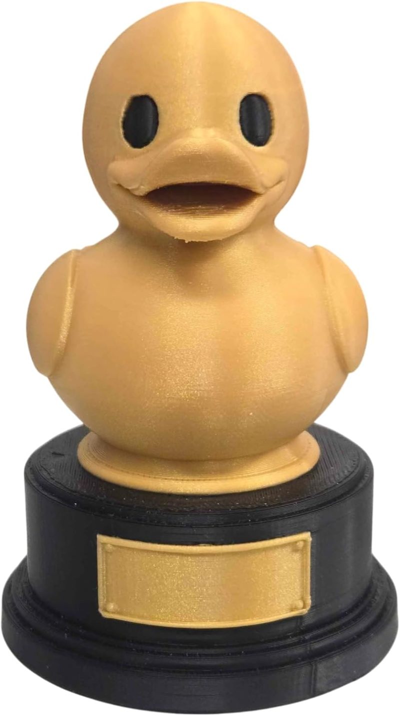 The Gold Duck Trophy – Funny PLA Duck Statue Award for Office Games, Pranks & Gag Gifts – Collectible Display Piece with Black Base is a decorative 3D printed collectible from 3DCentral’s extensive duck collection. Printed at our Quebec-based industrial print farm, this piece captures the playful spirit of rubber duck culture with modern additive manufacturing precision. Premium PLA filament ensures vibrant colors and a smooth, display-ready finish straight out of the box.