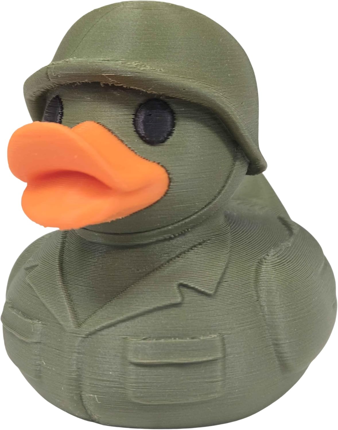 The Green Army Man Duck Figurine – Meets Soldier – Novelty Soldier Mash?Up Decor – Funny Military Duck Collectible for Desk, Shelf or Gift for Teens & Adults is a decorative 3D printed collectible from 3DCentral’s extensive duck collection. Printed at our Quebec-based industrial print farm, this piece captures the playful spirit of rubber duck culture with modern additive manufacturing precision. Premium PLA filament ensures vibrant colors and a smooth, display-ready finish straight out of the box.