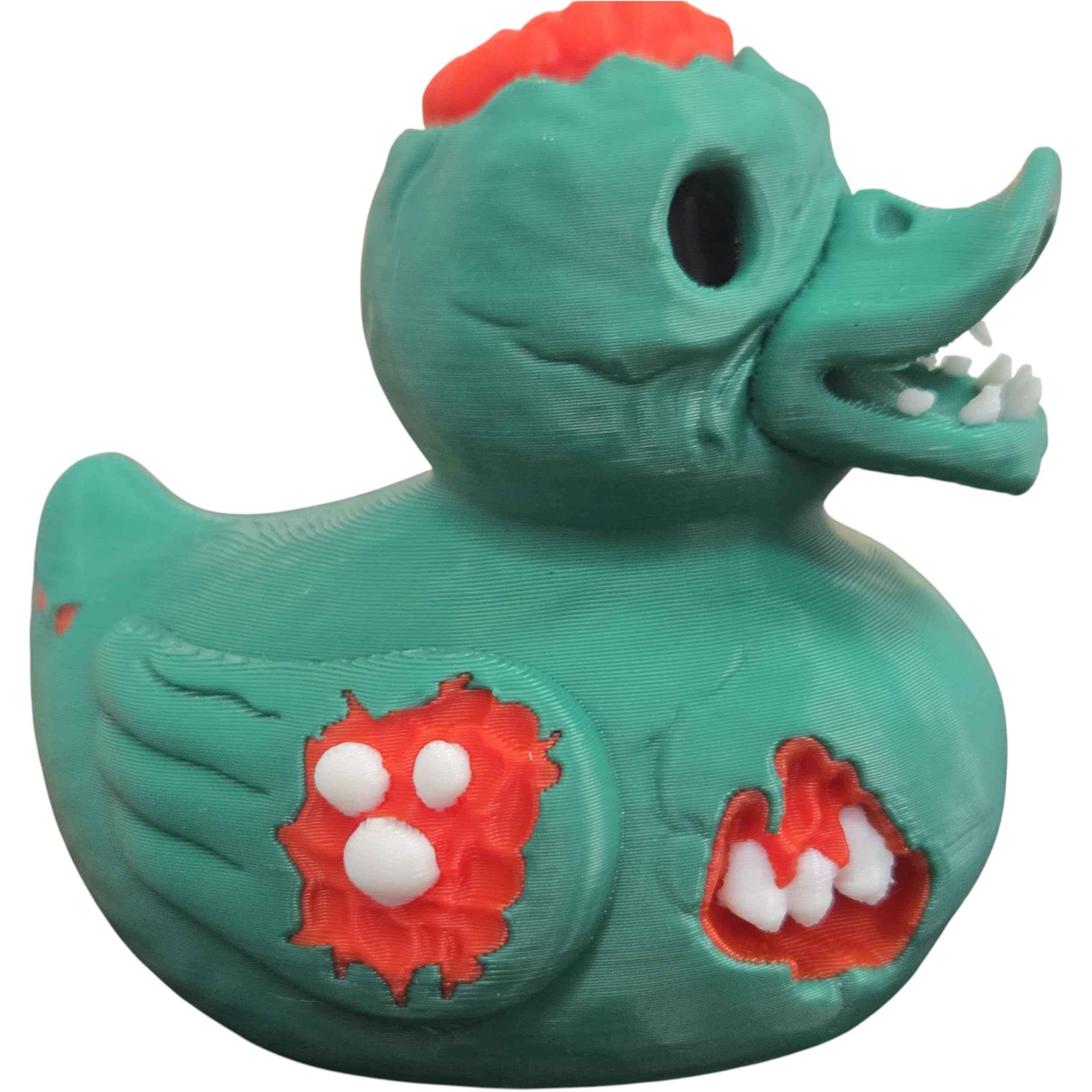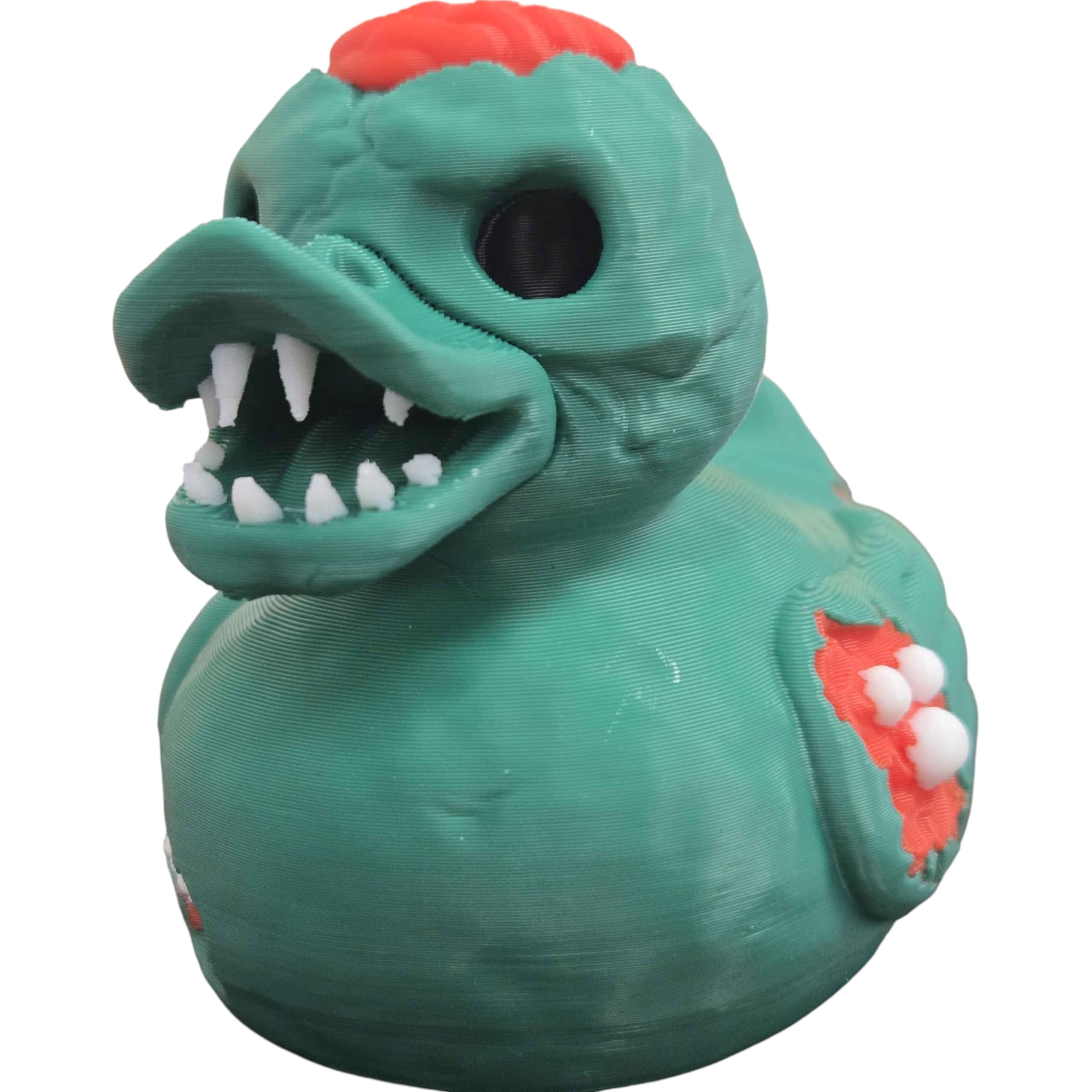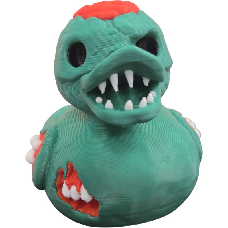 The Gruesome Zombie Duck Figurine – Creepy Halloween Rubber Duck Collectible with Brain & Bitemarks is a decorative 3D printed collectible from 3DCentral’s extensive duck collection. Printed at our Quebec-based industrial print farm, this piece captures the playful spirit of rubber duck culture with modern additive manufacturing precision. Premium PLA filament ensures vibrant colors and a smooth, display-ready finish straight out of the box.