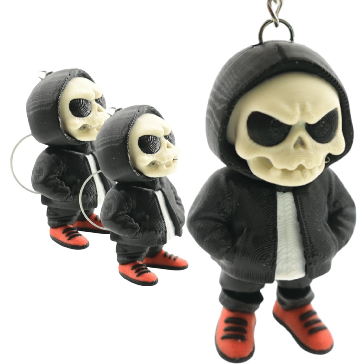 About the Grumpy Skull Hoodie Articulated Keychain (Pack of 3) – Skeleton Mini Figure with Hooded Jacket & Red Sneakers for Bags, Halloween Decor & Collectors