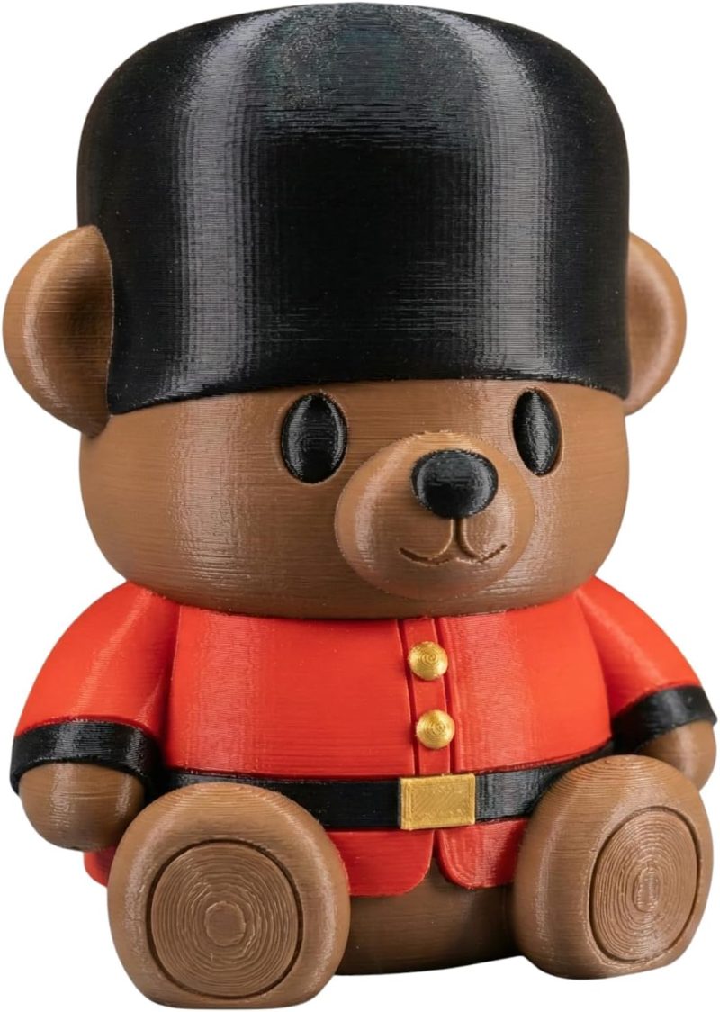 Meet the Guardsman Royal Teddy Bear Cub Figurine – Adorable British-Inspired Bear in Red Uniform – Cute Desk Decor or Gift for Collectors — a unique 3D printed teddy bear collectible from our Laval, Quebec print farm. This figurine blends classic teddy bear appeal with the precision of industrial 3D printing, producing textures and details that give each piece a handcrafted, artisanal quality.