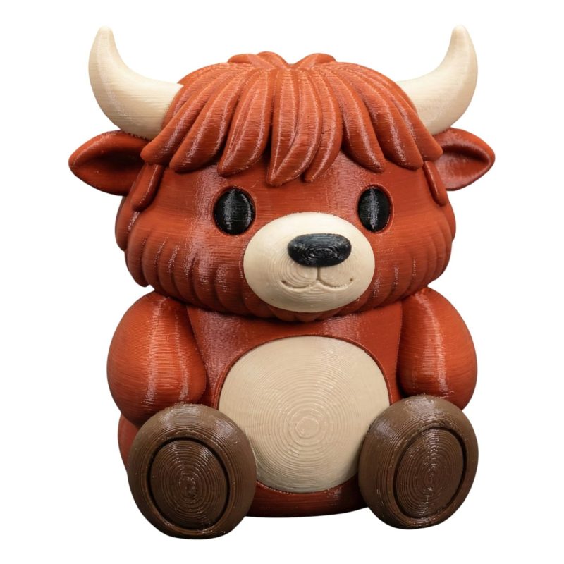 This Highland Cow Teddy Bear Cub Figurine – Cute Kawaii Sitting Highland Cattle Collectible for Desk or Shelf Décor – Adorable Red Brown Mini Cow Statue brings warmth to any display with its charming teddy bear design. Produced on 3DCentral’s industrial print farm in Quebec, the piece is printed in premium PLA filament with settings optimized for capturing the soft textures and cozy proportions that make teddy bear figurines beloved collectibles.