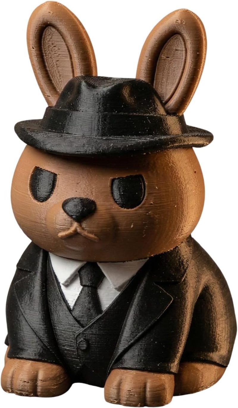 Designed by our creative team at 3DCentral. Every Mafia Bunny Figurine – Mobster Bunny is produced on our fleet of 200+ industrial 3D printers in Laval, Quebec. We calibrate each machine for the specific demands of decorative collectibles — optimizing layer adhesion, surface finish, and color accuracy. The result is a display-ready piece that captures fine textures and proportions faithfully from the original digital sculpture.