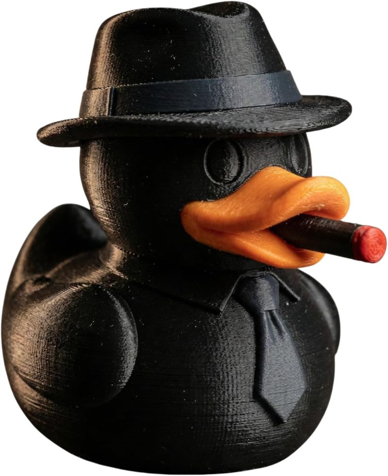This Mafia Duck Figurine with Cigar and Fedora Hat – Funny Mob Boss Rubber Duck Decor for Desk, Shelf, or Mancave is part of 3DCentral’s Ducks collection. We add new designs regularly and retire limited editions periodically to maintain collector value. Display on a shelf, desk, or in a dedicated collection cabinet. The piece is lightweight yet sturdy, suited for any indoor display setting. Multi-pack bundles are available for building complete themed displays.