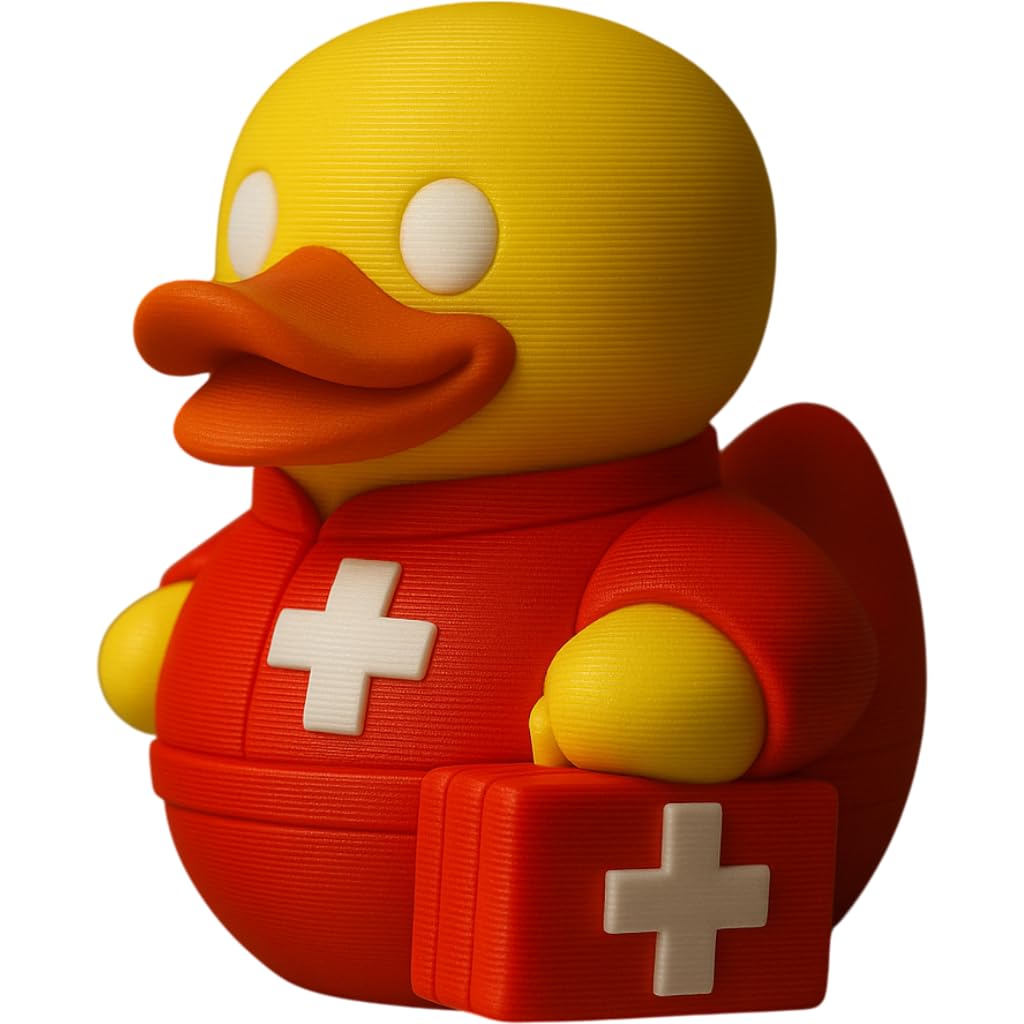 The Rescue Duck Figurine – Red Medical First Aid Duck Collectible with Cross Symbols & Emergency Kit – Funny Gift for EMTs, Nurses & Medics is a decorative 3D printed collectible from 3DCentral’s extensive duck collection. Printed at our Quebec-based industrial print farm, this piece captures the playful spirit of rubber duck culture with modern additive manufacturing precision. Premium PLA filament ensures vibrant colors and a smooth, display-ready finish straight out of the box.
