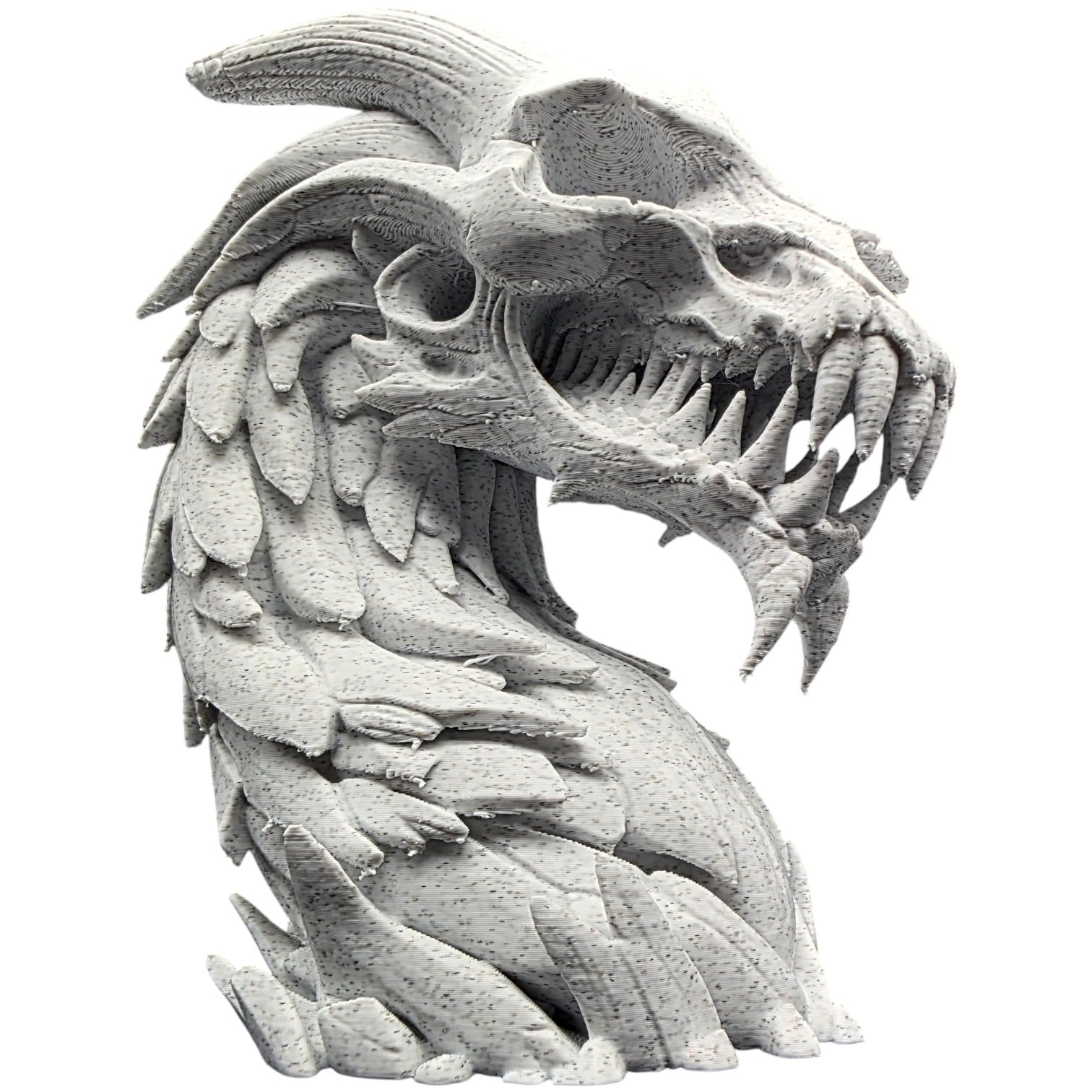 The Undead Rock Dragon Bust – Gothic Fantasy Dragon Skull Sculpture for Desk, Shelf or Game Room Display – Bone-White Horned Monster Statue is a detailed display bust from 3DCentral’s collectible series. Printed at fine layer heights (0.12-0.16mm) on our industrial print farm in Quebec, this piece captures facial expressions, hair textures, and decorative elements with remarkable precision. A striking addition to any shelf or desk display.