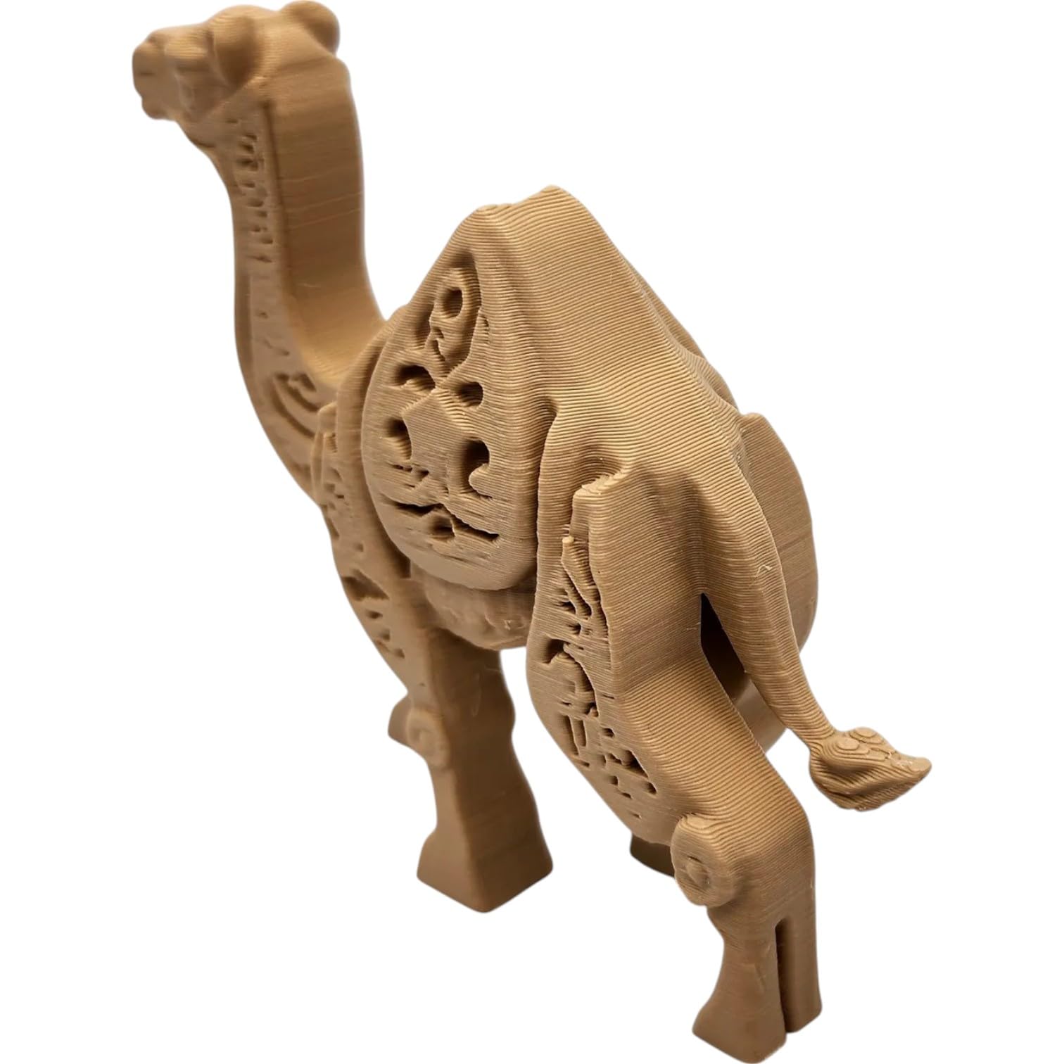 The Wood-Carved Style Camel Figurine – Decorative Animal Sculpture with Intricate Cutout Detailing is part of 3DCentral’s growing catalog of 3D printed collectibles. Produced on our industrial print farm in Laval, Quebec, this piece is printed in premium PLA filament with settings optimized for decorative objects. Every unit is inspected for surface quality and color accuracy before shipping.