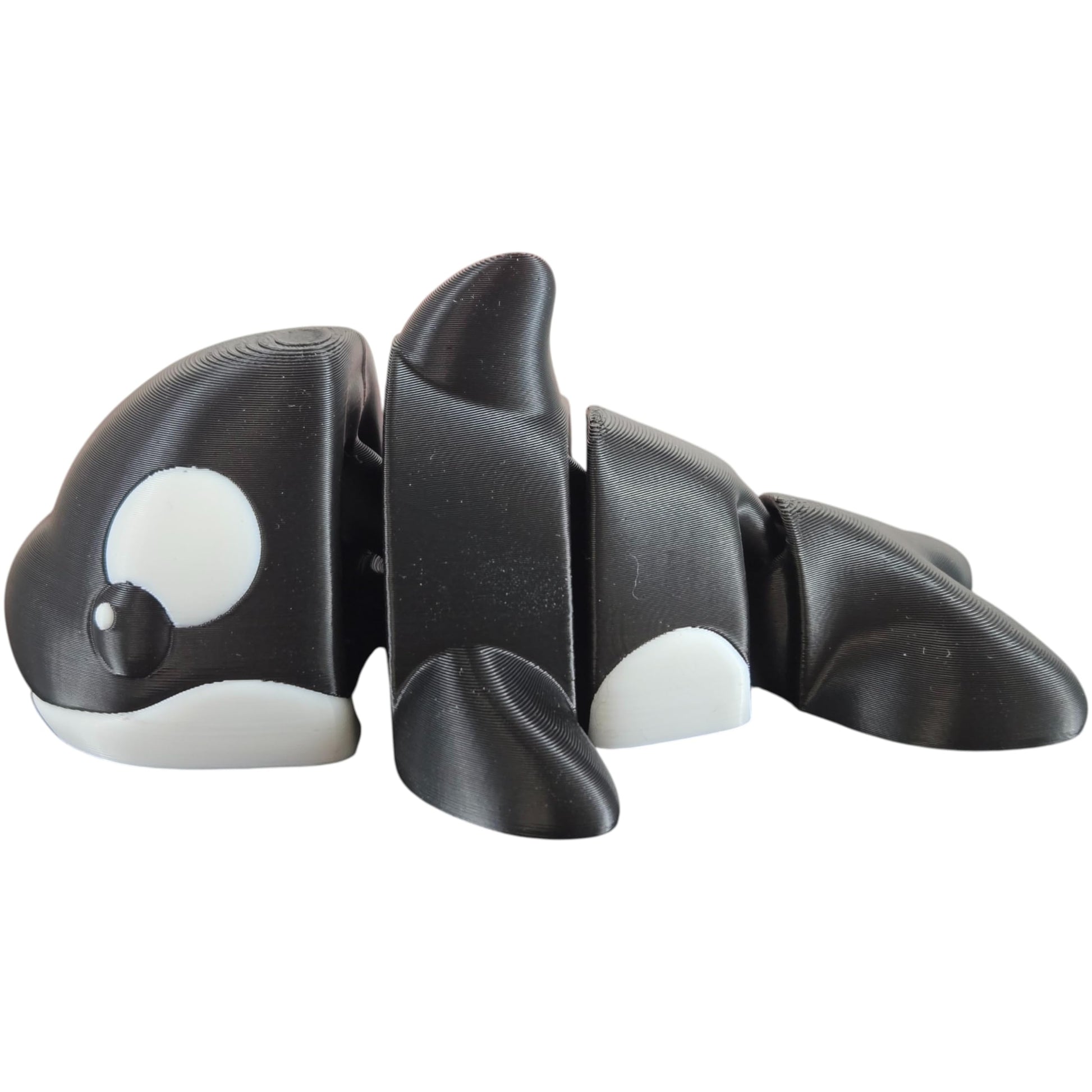 Make a splash with this irresistibly adorable articulated orca fidget featuring big eyes and smooth, flexible joints! Expertly 3D printed by 3DCENTRAL SOLUTIONS in Quebec, Canada, this charming black-and-white killer whale is as delightful to fidget with as it is to display. The segmented design creates satisfying movement in your hands, making it perfect for sensory engagement, anxiety relief, or ocean-themed décor. With its oversized cartoon-style eyes and lovable expression, this mini orca is sure to bring smiles wherever it lands—whether on a desk, shelf, or in the hands of a sea life lover.⚠️ WARNING: Choking Hazard – Small parts. Not suitable for children under 15 years. This product is not intended as a toy for young children.