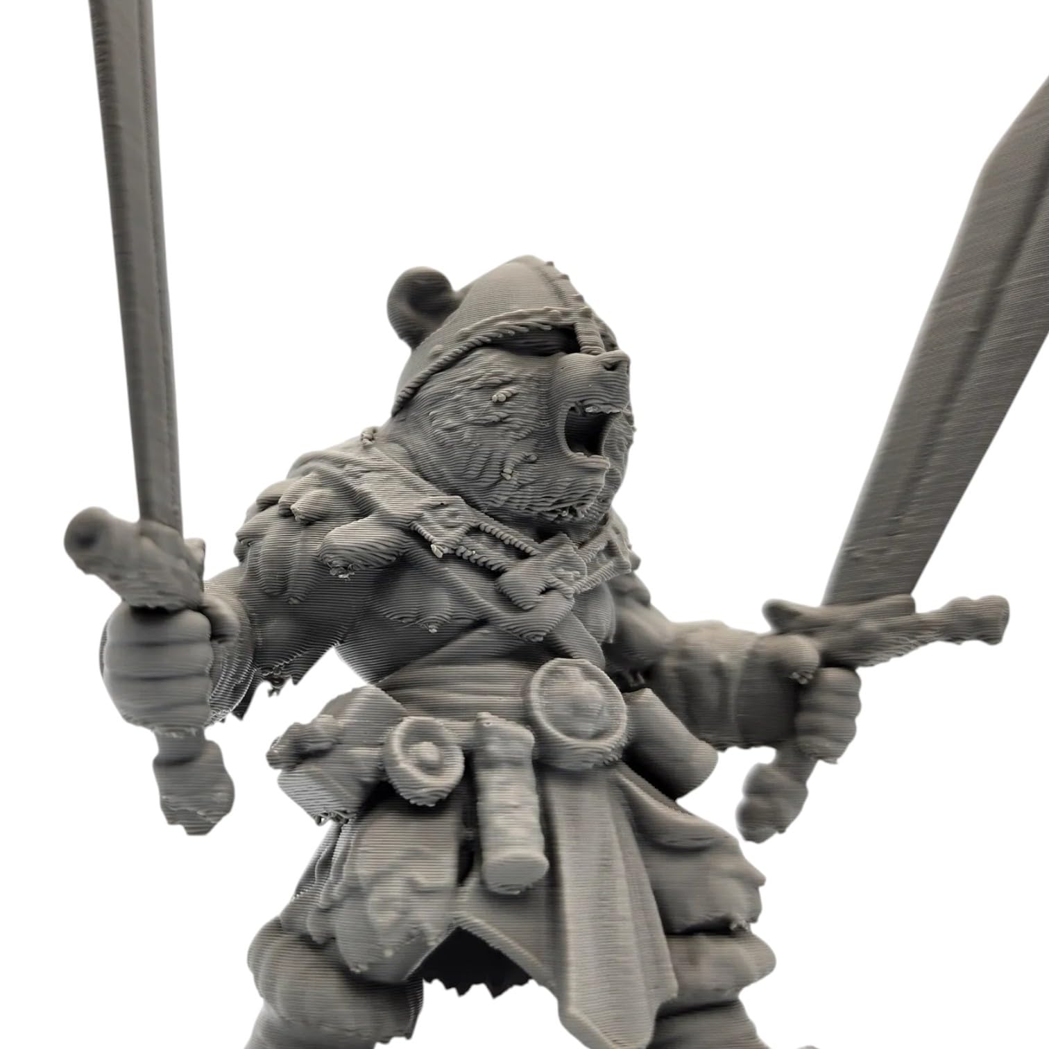 Unleash unrelenting rage with The Bearserker, a ferocious dual-blade warrior from the Owls & Dragons universe. This snarling, armored bear charges into combat with swords in both paws, clad in worn leathers, battle wraps, and a rugged helmet. With roaring mouth and wild stance, this figure radiates brute strength and raw fury—perfect for tabletop play, paint sessions, or heroic displays. Expertly 3D printed in Quebec by 3DCENTRAL SOLUTIONS, this high-detail PLA figurine captures every scar, fur strand, and weapon edge with precision. From his torn cloak to his bulging muscles, The Bearserker is an unmissable character for fantasy fans, RPG hobbyists, and collectors of beastly warriors.